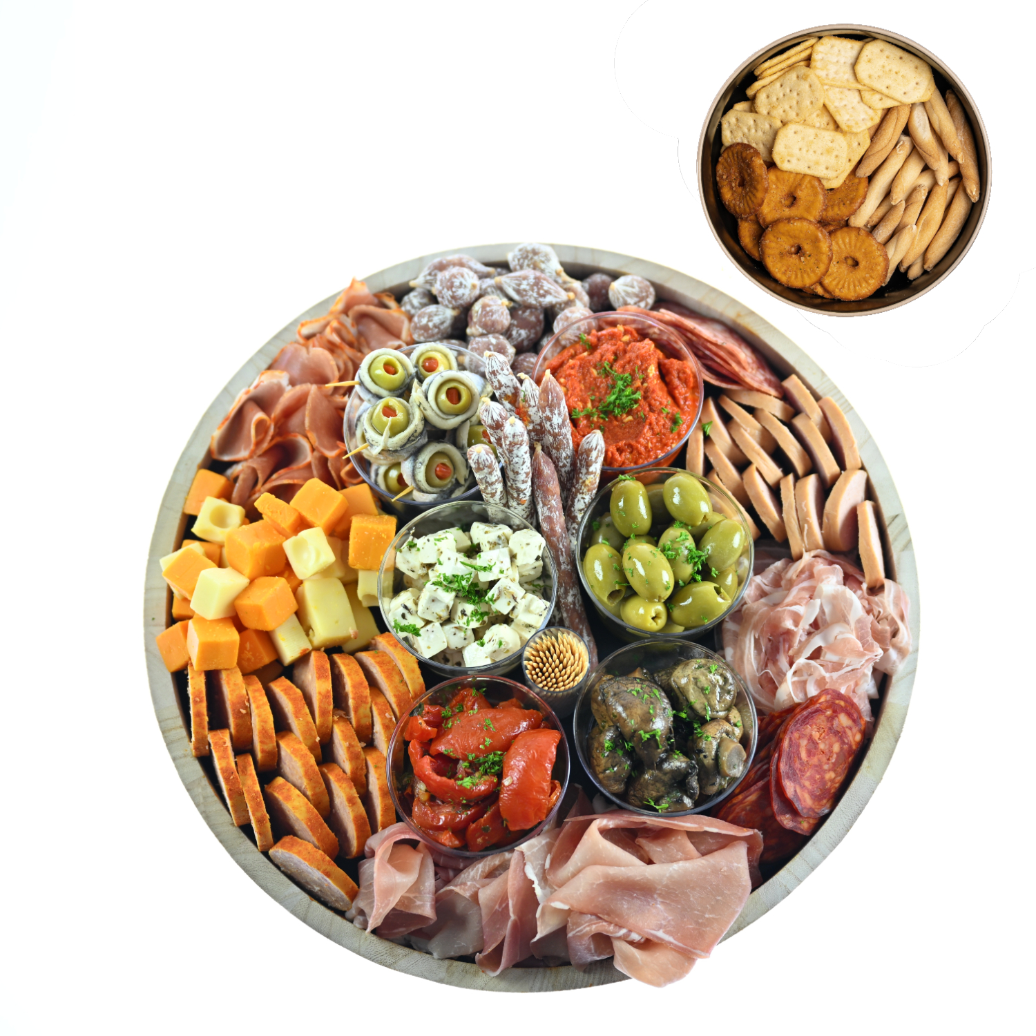 Verzorgde schotel voor ± 6 personen, met verschillende zuiderse vleeswaren, kaasjes en tal van antipasti.