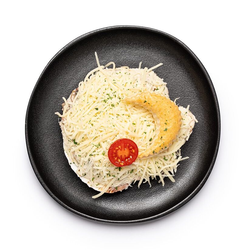 Visschelp opgevuld met een rijk assortiment aan vis, vissaus en kaas